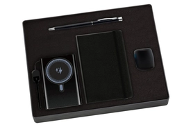 Bu konsept kutu hediye setinde mükemmel ses deneyimi yaşayacağınız OTIS speaker, LED logolu powerbank, siyah bir defter ve şık bir kalem bulunuyor.
