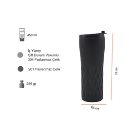 Kapasite: 450 ml Çift Duvarlı ve Vakumlu Ağırlık: 256 gr İç Yüzey: 304 Paslanmaz Çelik Dış Yüzey: 201 Paslanmaz Çelik Ölçü: 210 mm x 85 mm