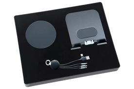 Firmanıza özel logo baskılı bu promosyon seti, telefon tutucu, kablosuz şarj cihazı ve çoklu şarj kablosu içerir.